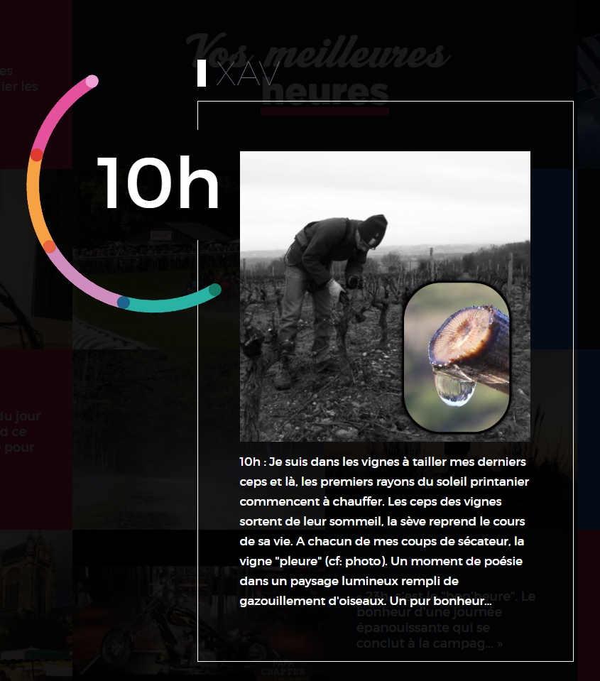 10 heures : Je suis dans les vignes à tailler mes derniers ceps et là, les premiers rayons du soleil printanier commencent à chauffer. Les ceps des vignes sortent de leur sommeil, la sève reprend le cours de sa vie. A chacun de mes coups de sécateur, la vigne "pleure" (cf: photo). Un moment de poésie dans un paysage lumineux rempli de gazouillement d'oiseaux. Un pur bonheur...